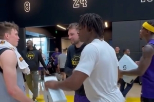 發(fā)福利啦!湖人官方曬昨日訓(xùn)練后東契奇向全隊贈送簽名球鞋