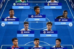 中場:布雷諾-比頓(科林蒂安,1200萬歐)、安德烈-桑托斯(切爾西,3500萬歐)、薩維尼奧(曼城,5000萬歐)、埃斯特旺(切爾西,6000萬歐)、拉揚(達伽馬,1800萬歐)