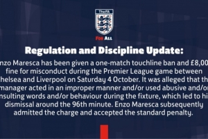 切爾西主教練馬雷斯卡因在10月4日周六對陣?yán)锲值挠⒊?lián)賽中存在不當(dāng)行為,被處以一場場邊禁賽及8000英鎊罰款。該指控指出馬雷斯卡在比賽第96分鐘被罰離場前,存在不當(dāng)行為或使用侮辱性、攻擊性言語。馬雷斯卡本人已承認(rèn)指控并接受標(biāo)準(zhǔn)處罰。