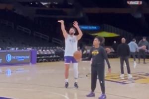體育資訊10月18日訊 今天,湖人前鋒馬克西-克萊伯賽前在球館內(nèi)進(jìn)行了三分訓(xùn)練。
