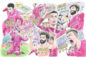 他的插圖將利物浦那場歷史性比賽中的七次慶祝畫面與歡騰的安菲爾德球場背景相結(jié)合。 球迷們很快就能在即將推出的安菲爾德球場新講談社角(Kodansha Corner II)近距離欣賞到這幅獨特的作品。
