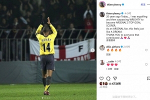 亨利配文寫道:“20年前的今天,我先是追平,此后超越了賴特,成為阿森納隊(duì)史第一射手。作為一名槍手球迷,這感覺就像做夢。感謝大家的付出。”