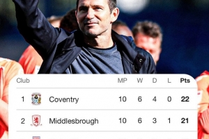 考文垂本賽季前10場英冠6勝4平保持不敗,在積分榜上以1分優(yōu)勢領(lǐng)先米德爾斯堡位居榜首,球隊10場比賽打進29球(聯(lián)賽最多),只丟7球(已經(jīng)連續(xù)5場零封)。