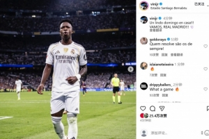維尼修斯賽后在個(gè)人社媒曬出慶祝照片,配文寫道:“主場度過美好的周日,皇馬加油!”