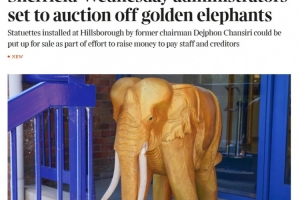 體育資訊10月28日訊 據(jù)《泰晤士報(bào)》報(bào)道,進(jìn)入托管狀態(tài)的謝周三俱樂部正采取多種措施籌集資金,托管人準(zhǔn)備拍賣掉前主席錢西里安放在希爾斯堡球場的兩尊標(biāo)志性金象雕像。這些雕像因擔(dān)心被球迷破壞或盜竊已被移至室內(nèi)。