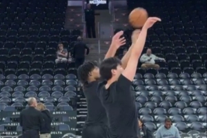 練起來!楊瀚森賽前和夏普一起進行三分投籃熱身