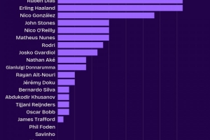 體育資訊10月31日訊 數(shù)據機構squakwa統(tǒng)計了本賽季曼城隊內的英超成功爭頂情況,哈蘭德和魯本-迪亞斯并列最多。