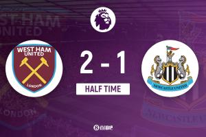 上半場(chǎng)比賽結(jié)束,西漢姆聯(lián)2-1紐卡斯?fàn)柭?lián)。