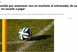據(jù)馬德里高級警察總局通報,事件發(fā)生在本周日,位于馬德里奧爾塔萊薩區(qū)的一處足球場附近。被捕者與其兒子的足球教練發(fā)生激烈爭吵,多名目擊者向警方證實該男子曾手持砍刀作出暴力姿態(tài)。