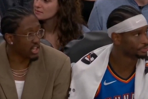 比賽最后時刻,鏡頭給到板凳席上的雷霆眾將,亞歷山大和仍在養(yǎng)傷的杰倫-威廉姆斯神同步。