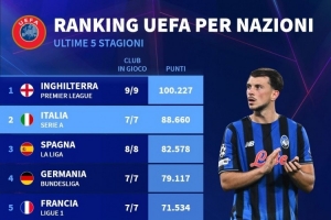 各國聯(lián)賽歐戰(zhàn)總積分排名(近5個賽季):