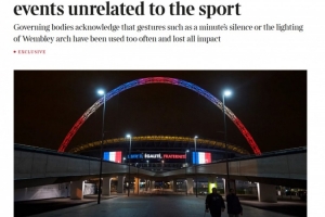 英足總、英超聯(lián)賽和英格蘭足球聯(lián)賽成立了“世界事件工作組”(WEWG),以指導(dǎo)英格蘭足球?qū)χ卮笫澜缡录姆磻?yīng)。除非事件與足球有直接關(guān)聯(lián),否則聯(lián)賽將不會(huì)舉行默哀儀式,也不會(huì)點(diǎn)亮溫布利球場的拱門。