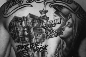 萊奧紋身的右側是圣母瑪利亞的頭像,左側是他從小生活的街區(qū)圖,中間還有兩塊路標,上面寫著萊奧家鄉(xiāng)塞圖巴爾區(qū)的郵編2845。紋身的左下方是一句口號“冒險”,旁邊是輪盤賭和四張A撲克牌。