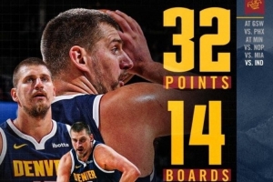 賽后,掘金官方發(fā)布約基奇數(shù)據海報,并寫道:“這些都是他在32分鐘里做到的??”