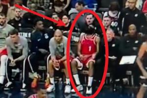 有點(diǎn)疲憊?哈登被換下場(chǎng)一屁股癱坐在板凳上&抬頭仰面