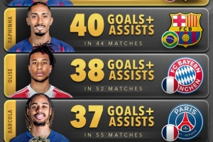 體育資訊11月10日訊 Score90統(tǒng)計(jì)了2025年五大聯(lián)賽邊鋒在俱樂部+國(guó)家隊(duì)比賽中參與進(jìn)球的數(shù)量,并列出榜單。