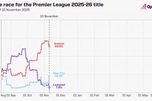 英超奪冠概率走勢:利物浦從領跑跌至7%,目前阿森納64%曼城23%