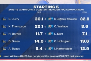 16勇士和本季雷霆首發(fā)對比:庫里30.1分克萊22.1 SGA32.8切特19.6