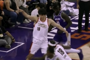 難受啊~楊瀚森被好兄弟馬盧阿奇干擾球 向裁判申訴但沒吹罰