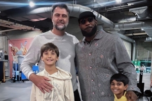 姚明苦主!詹姆斯今日賽后與爵士名宿奧庫寒暄并合影