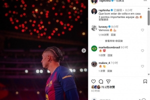 本場比賽也是巴薩回歸諾坎普球場首戰(zhàn),迎來傷愈復出的拉菲尼亞在社媒曬照寫道:“回家的感覺真棒!球隊取得關(guān)鍵三分”