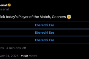 賽后阿森納官方在社媒發(fā)布投票,評(píng)選本場最佳球員,三個(gè)選項(xiàng)均為上演帽子戲法的埃澤。