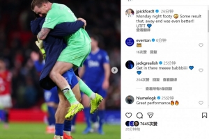 皮克福德社媒曬出慶祝的照片,配文:“周一足球之夜,這樣的結(jié)果太棒了,客場(chǎng)看臺(tái)的氛圍更是無敵,加油埃弗頓!”