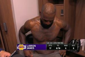 賽后,詹姆斯在更衣室接受采訪時僅用一條毛巾遮住重要部位,并不時調整。