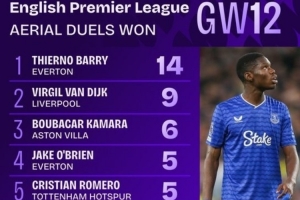 蒂爾諾·巴里對陣曼聯(lián)完成14次成功爭頂,是本賽季英超單場最多