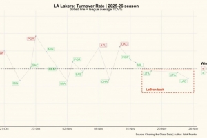 備注:虛線為聯(lián)盟平均線,綠色為贏球比賽失誤率,紅色為輸球比賽失誤率