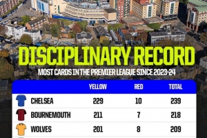 體育資訊12月1日訊 數(shù)據(jù)網(wǎng)站OPTA盤點(diǎn)了英超球隊(duì)自23/24賽季以來吃牌榜,其中切爾西229黃10紅,兩項(xiàng)數(shù)據(jù)均為最多,具體榜單如下: