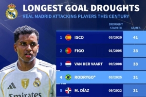 新世紀(jì)皇馬攻擊手最長(zhǎng)進(jìn)球荒榜:*當(dāng)前仍未結(jié)束