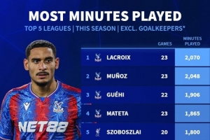 體育資訊12月5日訊 德國轉(zhuǎn)會市場統(tǒng)計了本賽季五大聯(lián)賽非門將球員的出場時間,并列出榜單,水晶宮球員占據(jù)前四名,范戴克第六,姆巴佩第八、凱恩第九。