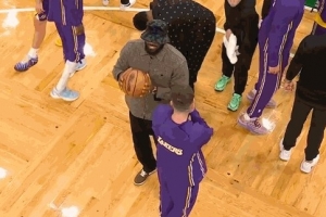 要不換衣服上場?暫停期間詹姆斯便裝在場內拿著球 摩拳擦掌