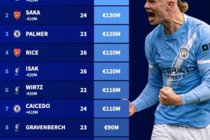 最新英超身價(jià)前十:哈蘭德2億 伊薩克降至1.2億 維爾茨降至1.1億