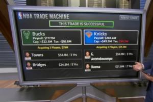 據(jù)此,ESPN薪資專家Bobby Marks進(jìn)行模擬交易,字母哥和庫茲馬去尼克斯,雄鹿得到唐斯和米卡爾·布里奇斯。