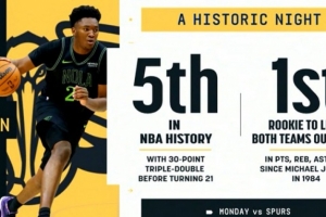 第5位21歲前砍下30+三雙的球員,比肩詹姆斯、東契奇、文班和??怂?/p>