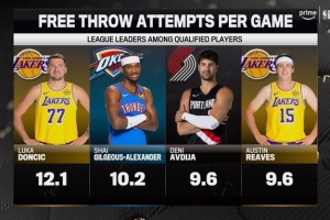 轉播方曬罰球前四:東契奇12.1次 SGA第2 阿夫迪亞/里夫斯并列第3