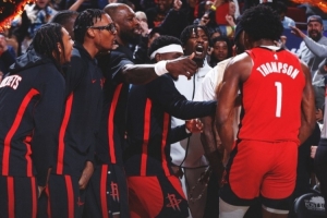 賽后火箭官方贏球海報(bào)封面人物給到了阿門·湯普森,為其末節(jié)最后時(shí)刻補(bǔ)籃打進(jìn)后的慶祝畫面。