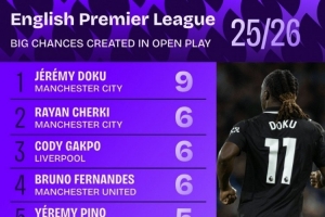 本賽季英超運動戰(zhàn)創(chuàng)造重大機會榜:多庫9次居首,B費、謝爾基6次