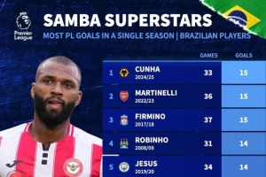 巴西球員英超單賽季進(jìn)球排行榜:24/25賽季庫尼亞33場15球第一