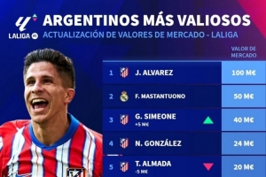 體育資訊12月13日訊 德國(guó)轉(zhuǎn)會(huì)市場(chǎng)更新了西甲球員的身價(jià),并列出西甲阿根廷球員身價(jià)排名,阿爾瓦雷斯1億歐居首,馬斯坦托諾5000萬(wàn)歐次席。
