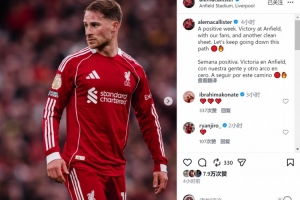 麥卡利斯特社媒曬出比賽照片,配文:“積極的一周,在安菲爾德與我們的球迷一起取得勝利,而且又一次完成零封,讓我們繼續(xù)沿著這條道路前進(jìn)。”