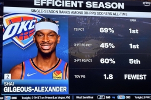 在單賽季所有場均至少30分的球員中,亞歷山大真實命中率69%、三分命中率45%皆是歷史第一;兩分球命中率60%是歷史第5,場均1.8助攻是歷史最少。