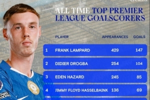 切爾西官方曬隊(duì)史英超進(jìn)球榜:蘭帕德147球居首,帕爾默升至第9