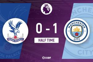 上半場傷停補(bǔ)時3分鐘,半場結(jié)束,曼城暫1-0水晶宮。