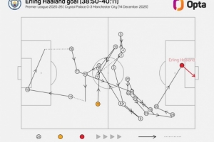 據(jù)統(tǒng)計(jì),哈蘭德本場(chǎng)首粒進(jìn)球經(jīng)過(guò)了球隊(duì)25次傳球,曼城上一次在英超通過(guò)更多次傳遞破門(mén)還是去年5月羅德里對(duì)陣西漢姆的進(jìn)球(31次)。