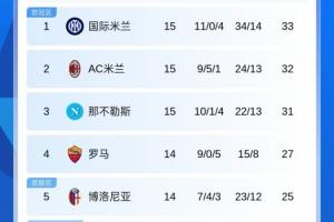 目前積分榜上,國(guó)米33分領(lǐng)跑,米蘭32分第二,那不勒斯31分第三。