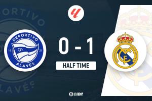 上半場傷停補時2分鐘,半場結(jié)束,皇馬暫1-0阿拉維斯。