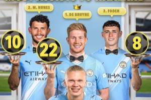 體育資訊12月15日訊 哈蘭德加盟曼城以來攻入147粒進球,Score90統(tǒng)計了球員在曼城助攻哈蘭德的次數(shù),并列出前三名榜單,德布勞內22助居首。